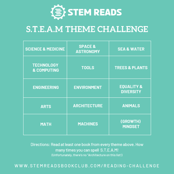 A PDF packet featuring: a personalizable cover page and reading certificate; two beautiful book-cover collages; secret link to the reading list; a printable "S.T.E.A.M. Theme" reading challenge.